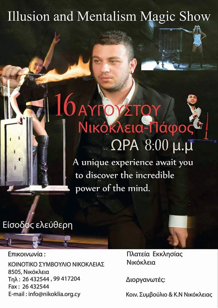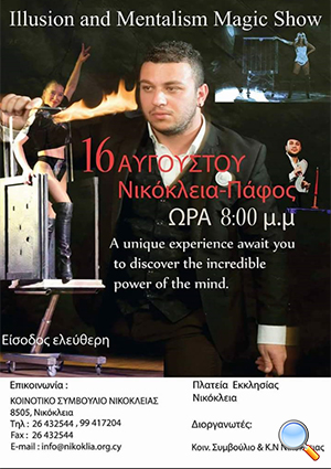 Τετάρτη 16 Αυγούστου 2017 ώρα 20:00 - Illusion and mentalism MAGIC SHOW με τον Γιώργο Ευρυδιχώρου.