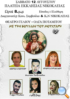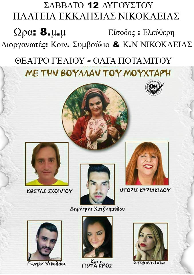 Σάββατο 12 Αυγούστου 2017 ώρα 20:00 - Θεατρική Παράσταση από το Θέατρο Γέλιου Όλγα Ποταμίτου ''ΜΕ ΤΗΝ ΒΟΥΛΛΑΝ ΤΟΥ ΜΟΥΧΤΑΡΗ''